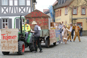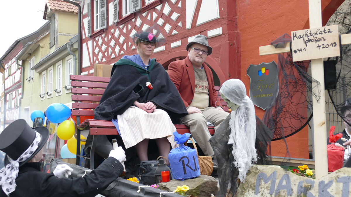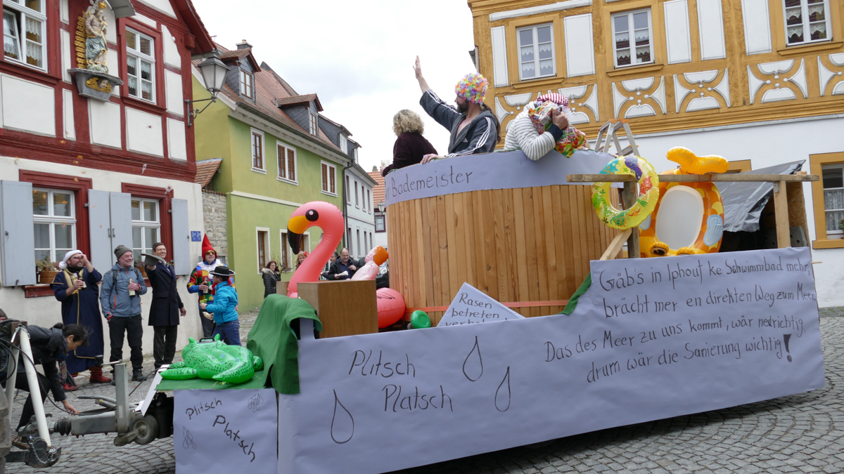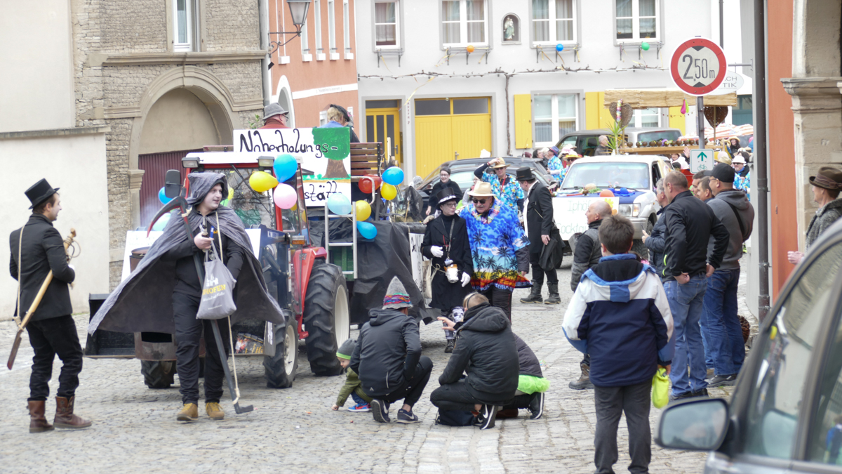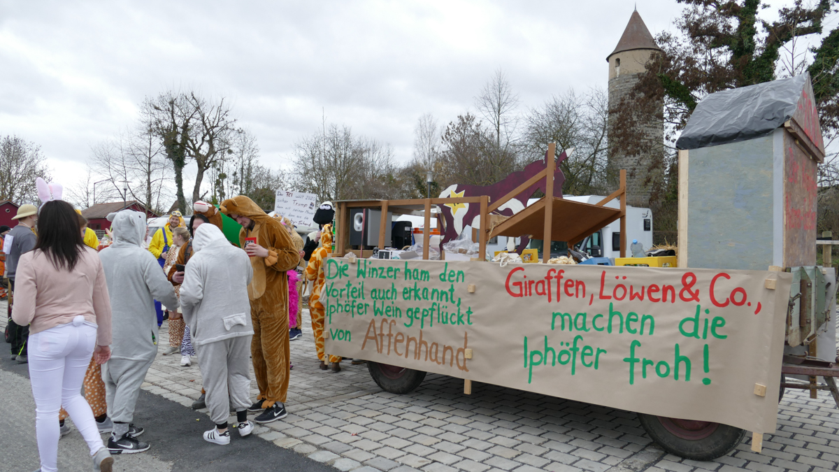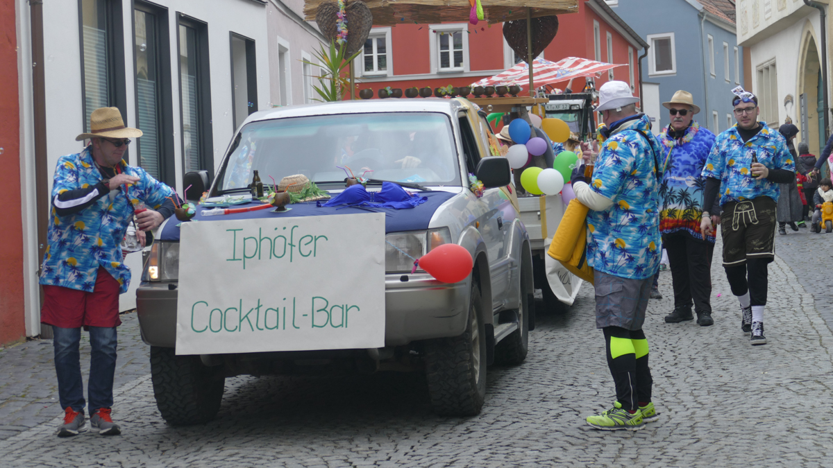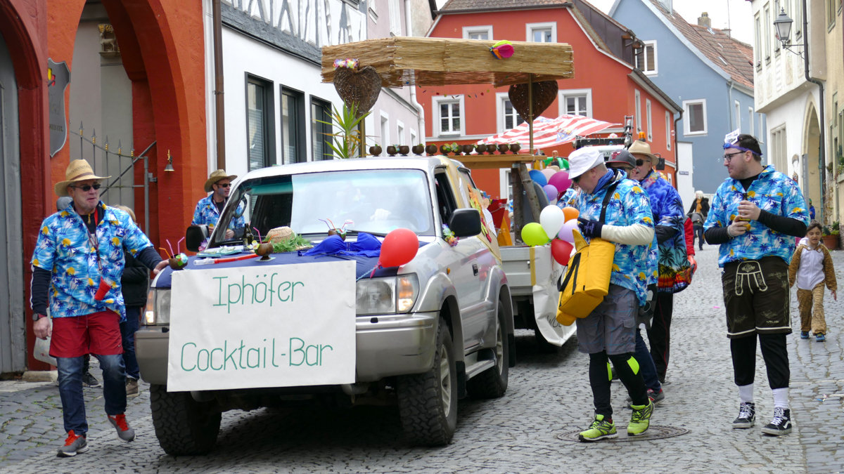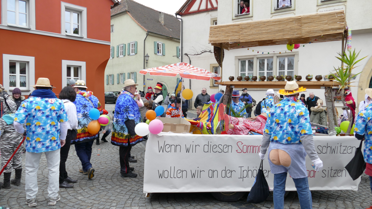 Beim Faschingsumzug treffen sich die Gruppen spontan am Busparkplatz und ziehen gemeinsam durch die Iphöfer Gassen zum historischen Marktplatz. Bunte Wägen und Fußgruppen mit aktuellen Themen waren auch heuer wieder mit dabei. Zahlreiche Gäste wurden mit Süssigkeiten und manch guten "Tröpfchen" vewöhnt.